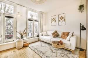 Living room with gray sofas and plants